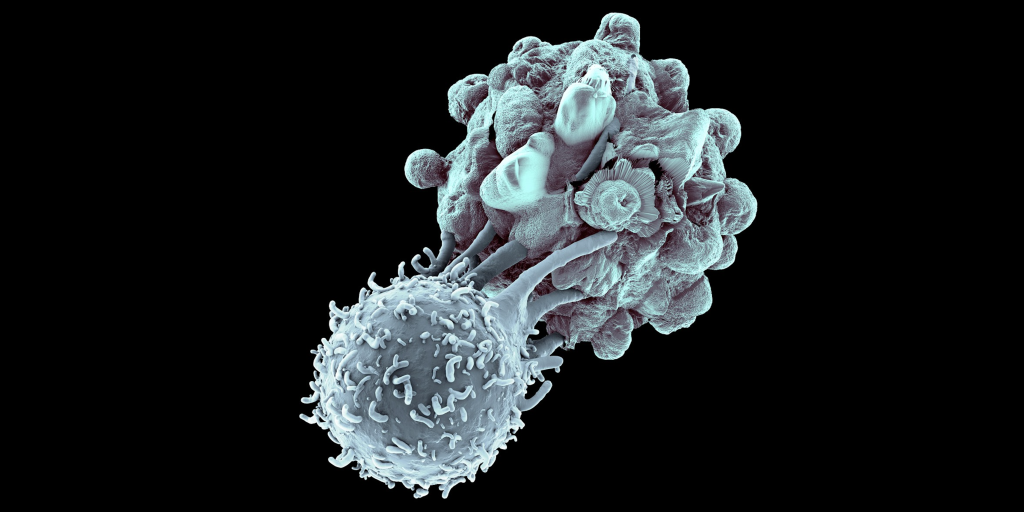 ‘n Geaktiveerde T-sel (links onder) val ‘n kankersel aan. 4. Eerste en tweede generasie immunoterapie – kankerselle oorleef en versprei as die kankersel homself kamoefleer sodat die liggaam se immuunstelsel nie meer die kankerselle as kanker herken nie. Met immunoterapie skakel die middel weer die afgeskakelde limfosiete (immuunstelsel) aan om self die kankerselle te beveg. Dit is veral die afgeskakelde T-limfosiete wat weer aangeskakel word. Een van die behandelings staan bekend as CAR-T-sel terapie. Die soort kankerbehandeling word nou ingespan teen gevorderde melanoom, longkanker, sekere kop- en nekkankers, slukdermkanker, limfome en Tripel negatiewe borskanke.