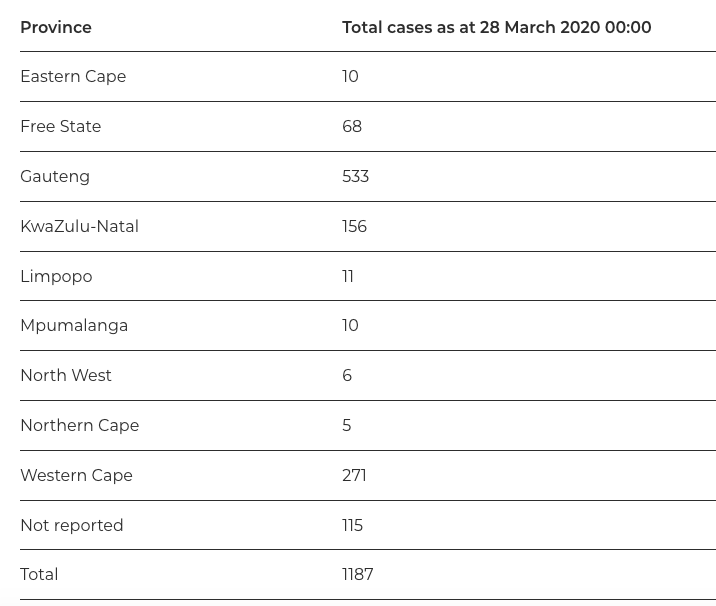 28 Maart 2020: SA staan steeds op 1187, met een sterfte. Dit blyk dat die 28-jarige vrou wat eergister in die Tygerberg-Hospitaal opgeneem en noodbehandeling ontvang het, nie COVID-19 onder lede gehad het nie.