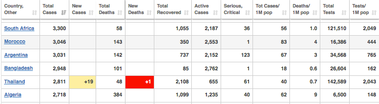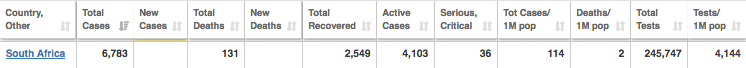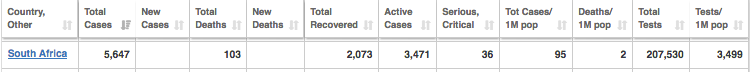 Wat betref COVID+ mense per 1 Miljoen van die populasie, is Suid-Afrika nommer 20 op die lys, en wat die sterftekoers betref, is Suid-Afrika nommer 44 op die lys.