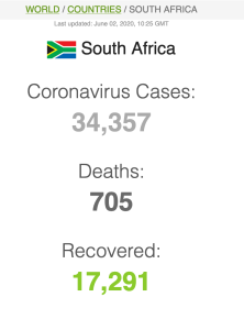 23 Maart 2020: Die NICD rapporteer op Twitter dat die aantal COVID-19 infeksies vir Suid-Afrika staan tans op 402 bevestigde gevalle. 128 nuwe gevalle sedert gister se aankondiging. Klik hier vir ‘n lewendige kaart van COVID-19 gevalle wêreldwyd.