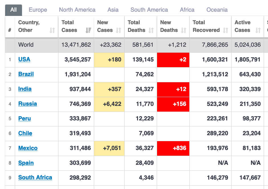 Suid-Afrika se totale aantal COVID+ gevalle is nou neënde hoogste in die wêreld. Maar om bloot na die totale aantal COVID+ gevalle te kyk, gee nie die werklike konteks van die verspreiding of omvang van die siekte in ‘n land nie.