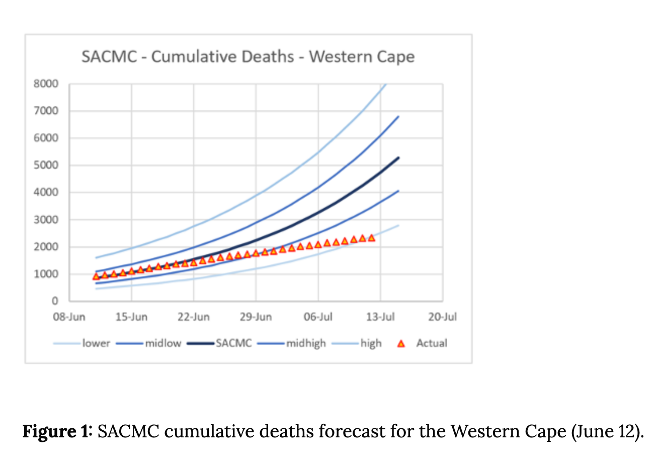Suid-Afrika sal sy sterftekruin tussen 21 Julie en 4 Augustus bereik. Wes-Kaap is reeds verby sy kruin, Oos-Kaap is naby sy kruin en Gauteng ook.