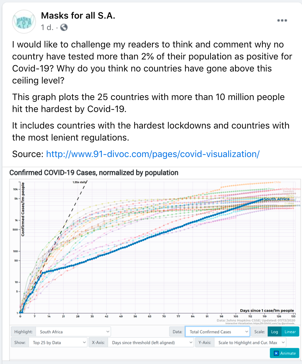 Suid-Afrika is maar nr 30 op die lys van lande in die wêreld as mens appels met appels vergelyk betreffende Covid+ gevalle per miljoen van die bevolking. Dit is net meer as 5000 per miljoen mense, dus 5 per 1000 mense, dus 0,5%. Dit is die helfte as dié in die VSA, wat op 1% staan. Nie een enkele land se Covid+ gevalle is meer as 2% nie; inteendeel alle lande staan tussen 0,2% en 2%.