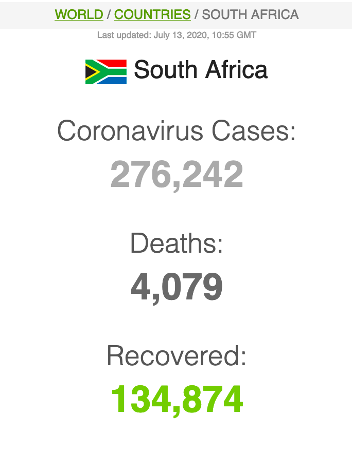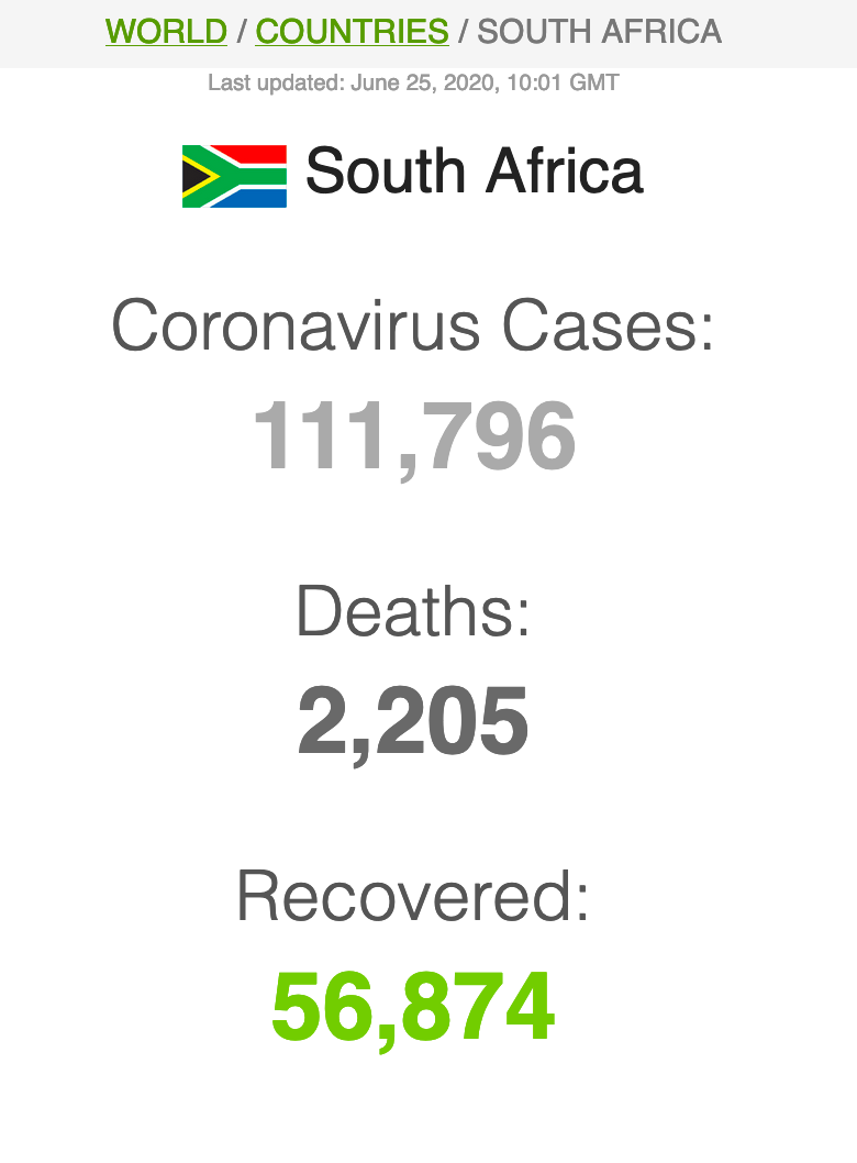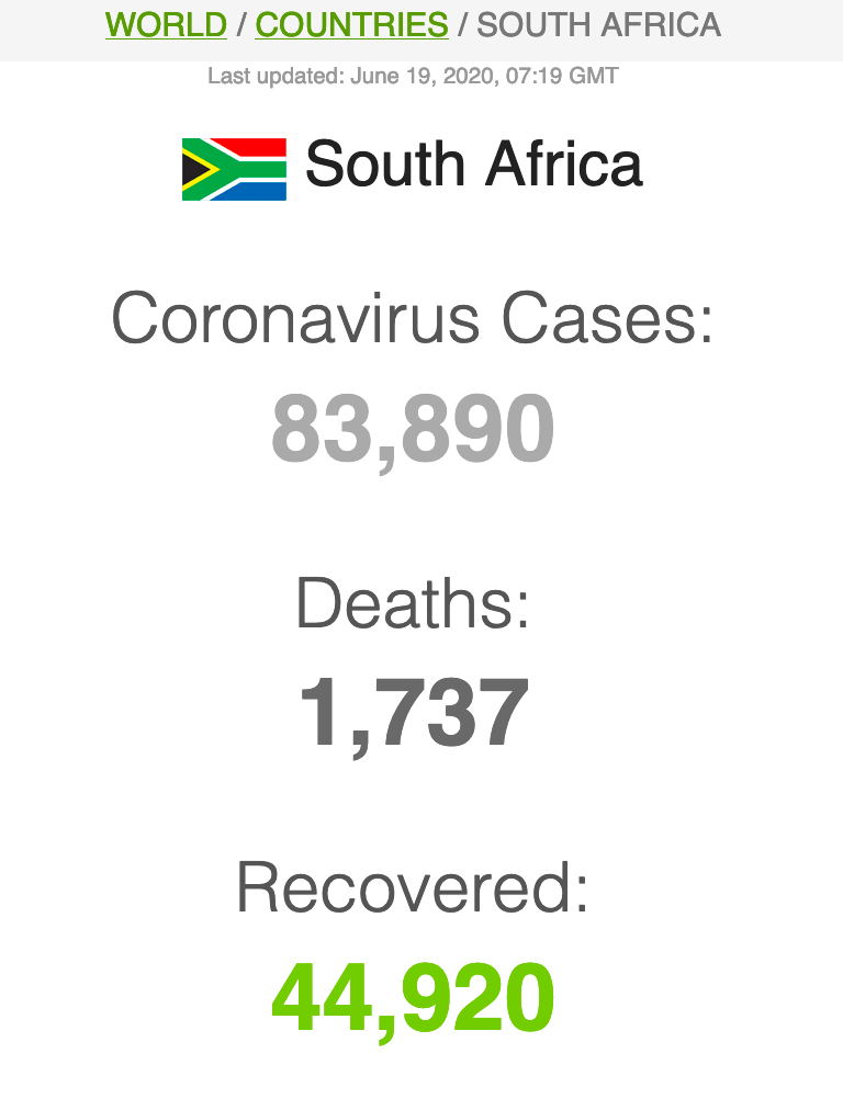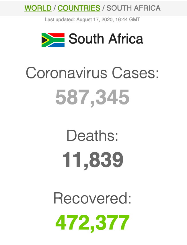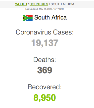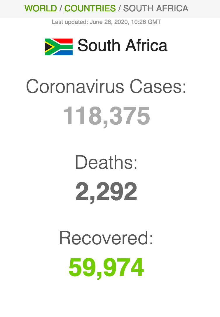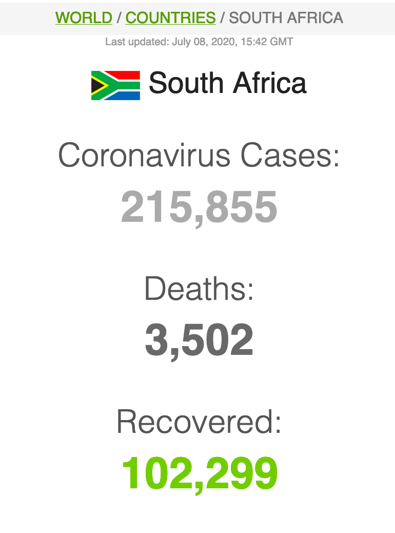 Let ook op dat Suid-Afrika meer mense het wat van Covid herstel het (191 059) as wat tans aktief siek is (173269).