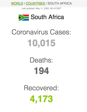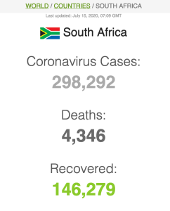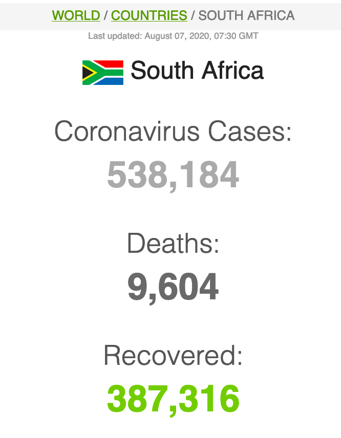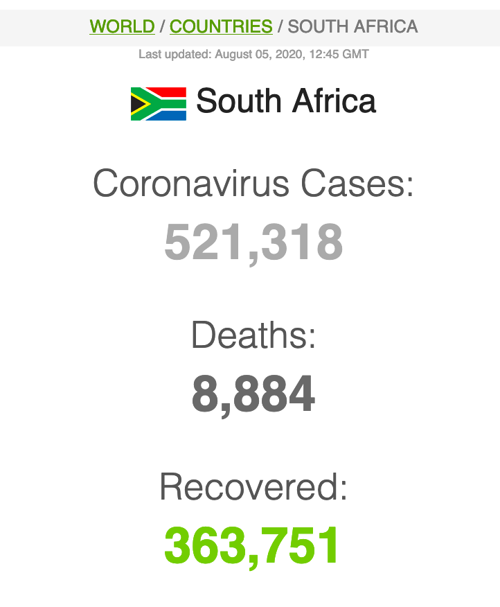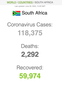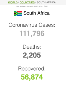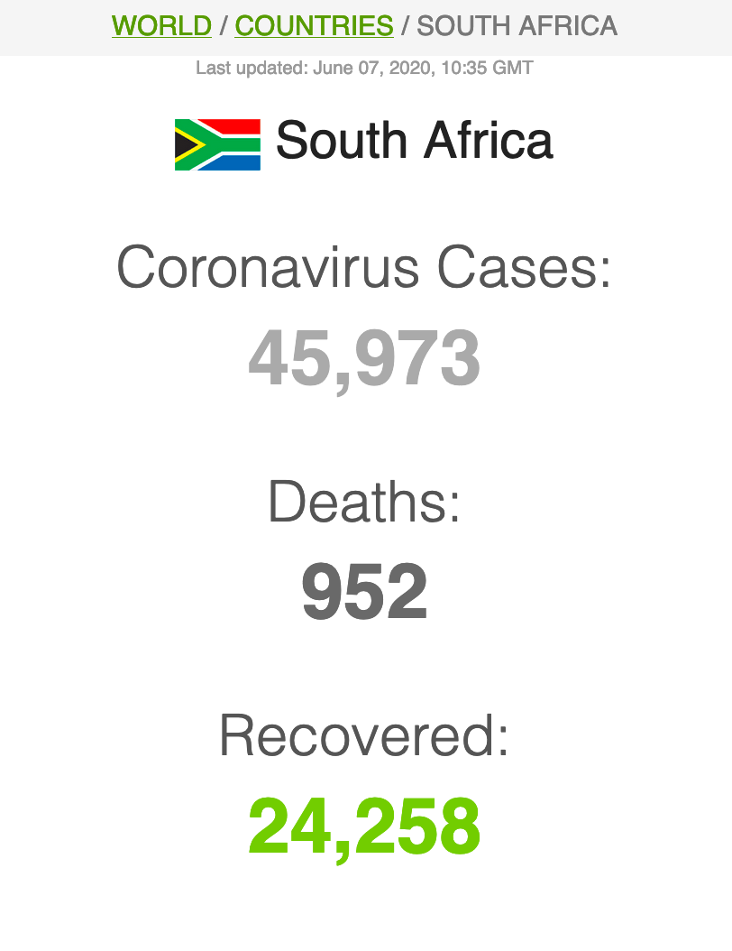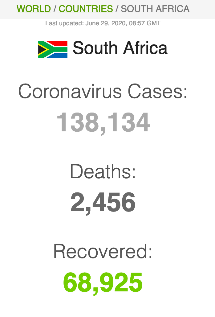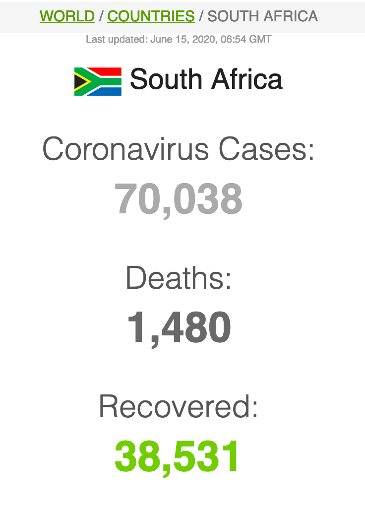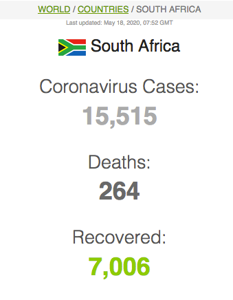 Let ook op dat Suid-Afrika meer mense het wat van Covid herstel het (191 059) as wat tans aktief siek is (173269).