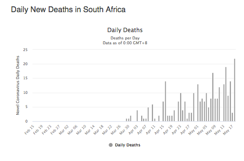 Die Wes-Kaap het sy hoogste sterftesyfer in een dag aangeteken sedert die uitbreking van die coronavirus in die provinsie. Die provinsie het gister 49 van die land se 52 sterftes aangeteken, ‘n dag nadat President Cyril Ramaphosa aangekondig het dat die land op 1 Junie na Vlak 3 sal afskaal. Die Wes-Kaap se dodetal het aan die begin van die Vlak 4 inperking op 42 gestaan, maar het intussen met 288 tot 330 gestyg. Dit is nie duidelik of die bevestigde dodetal van mense is wat in selfafsondering, by kwarantynpersele of in staatshospitale is nie. Die parlement se gesondheidskomitee en gekose komitee op gesondheid- en maatskaplike dienste besoek vandag die Tygerberg-hospitaal, die Nasionale Gesondheidslaboratorium en die Kaapstad se Internasionale Konferensiesentrum, wat as kwarantynlokaal ingerig is.