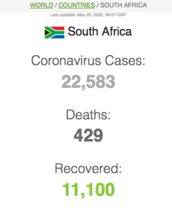 23 Maart 2020: Die NICD rapporteer op Twitter dat die aantal COVID-19 infeksies vir Suid-Afrika staan tans op 402 bevestigde gevalle. 128 nuwe gevalle sedert gister se aankondiging. Klik hier vir ‘n lewendige kaart van COVID-19 gevalle wêreldwyd.