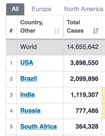 Suid-Afrika se totale aantal COVID+ gevalle is nou neënde hoogste in die wêreld. Maar om bloot na die totale aantal COVID+ gevalle te kyk, gee nie die werklike konteks van die verspreiding of omvang van die siekte in ‘n land nie.