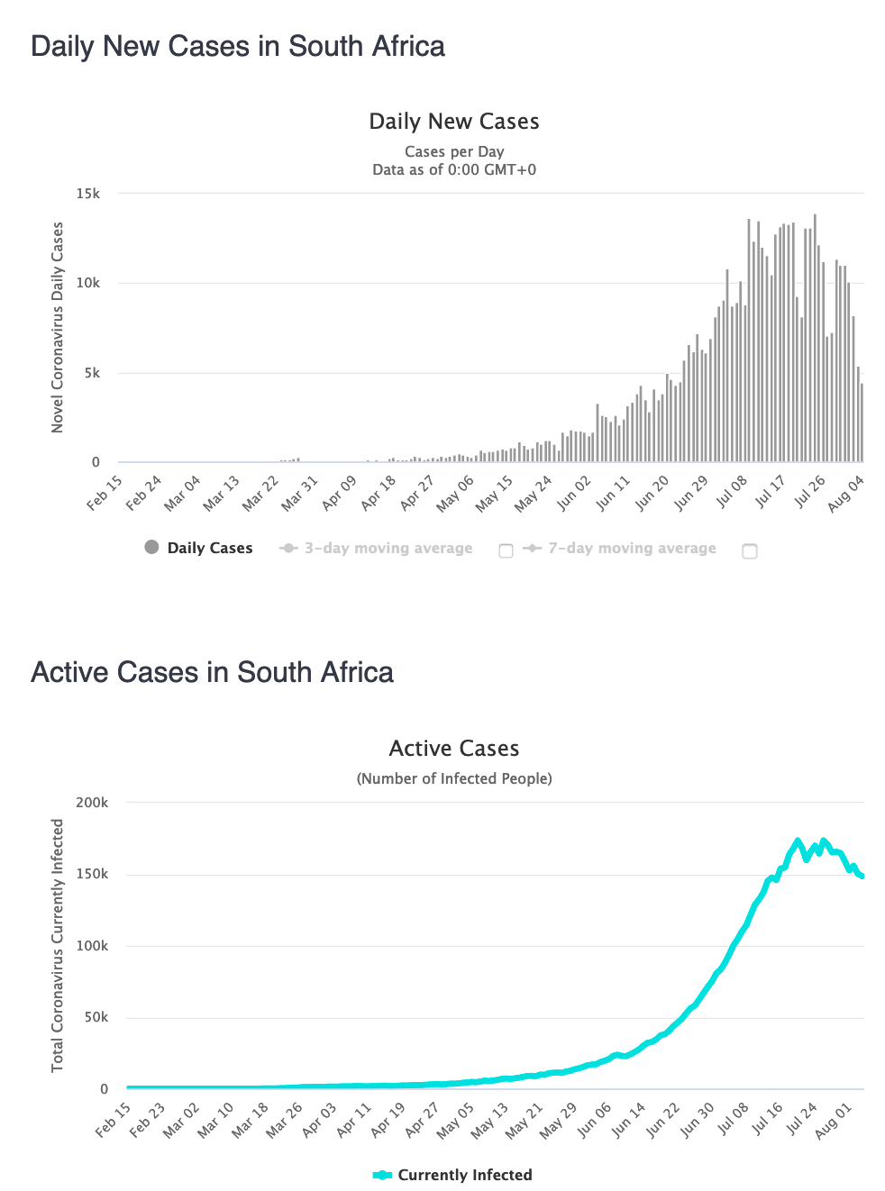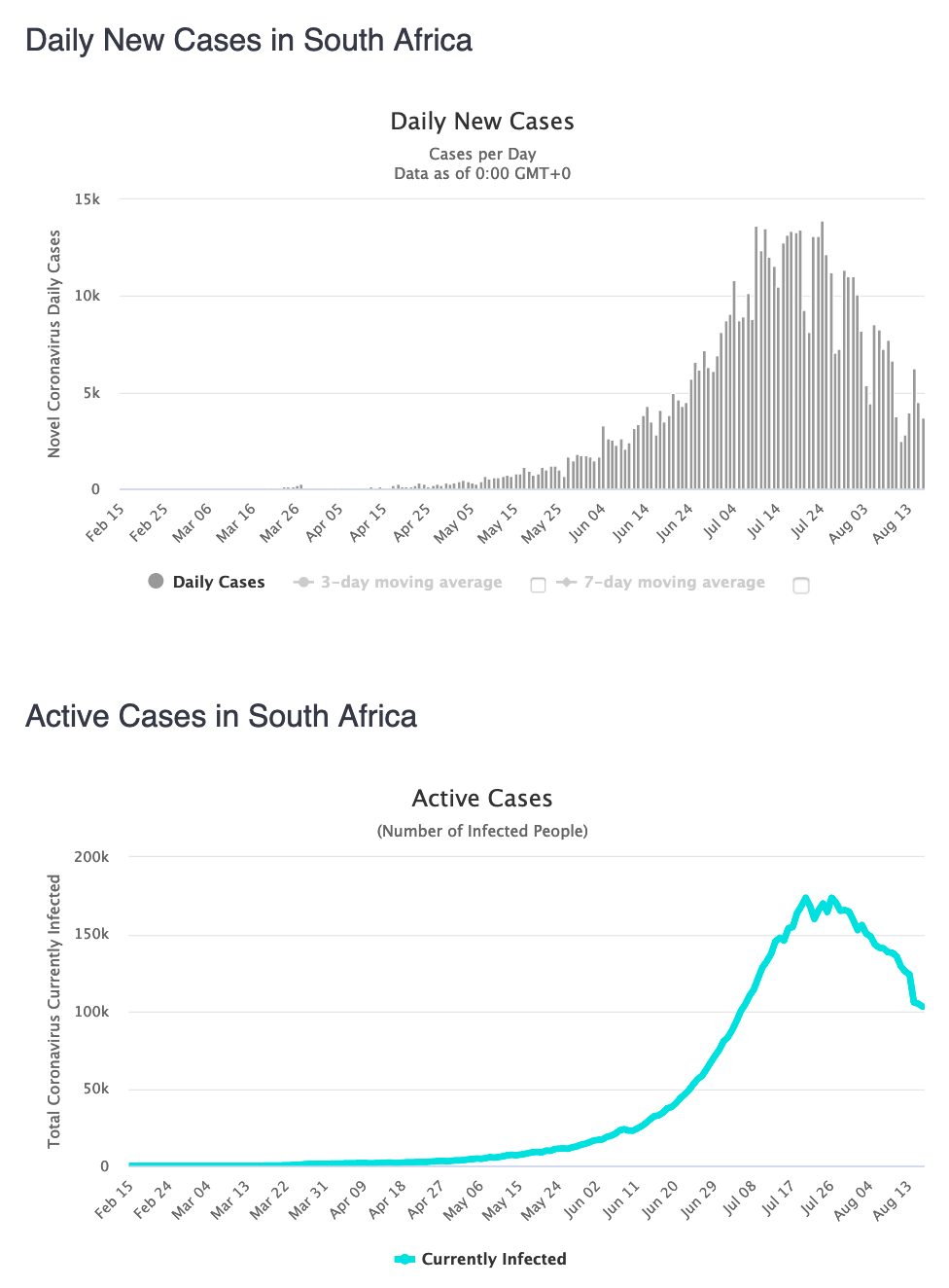 Voorts word slegs 17% van die totale aantal gevalle tans as aktiewe gevalle beskou. Die aantal nuwe gevalle per dag neem steeds daagliks af in die land, asook die sterftes per dag.