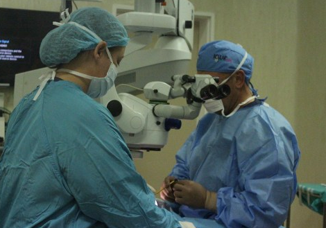 Dr Steve Steyn (regs) besig met oogchirurgie
